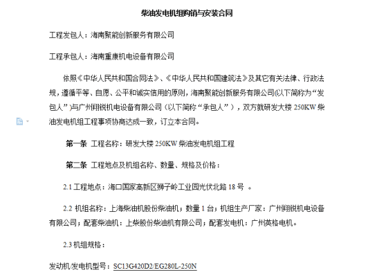 我公司為海南聚能創(chuàng)新供應(yīng)250KW上柴股份柴油機(jī)